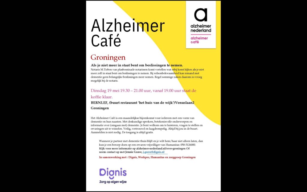 Alzheimer Café dinsdag 19 meiDoor Webmaster Schilderswijk / 28 april 2026 Dinsdagavond 19 mei is er weer Alzheimercafé in buurtrestaurant Bernlef.