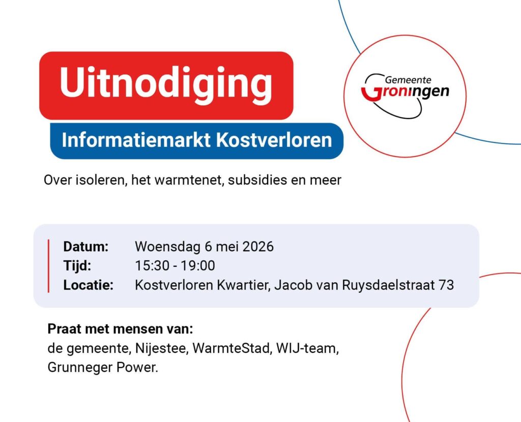 De gemeente, Nijestee, WarmteStad, het WIJ-team en Grunneger Power vertellen graag meer over wat er de komende jaren gaat gebeuren en wat dat voor jou betekent. Kom langs en stel je vragen over bijvoorbeeld het warmtenet, isoleren, subsidies en de werkzaamheden.