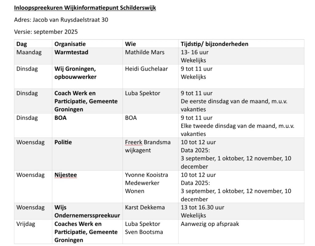 - Inloopspreekuren WijkinformatiepuntHet schema inloopspreekuren is geactualiseerd. Dit is de stand per september 2025. De nieuwste versie… Lees meer: Inloopspreekuren Wijkinformatiepunt