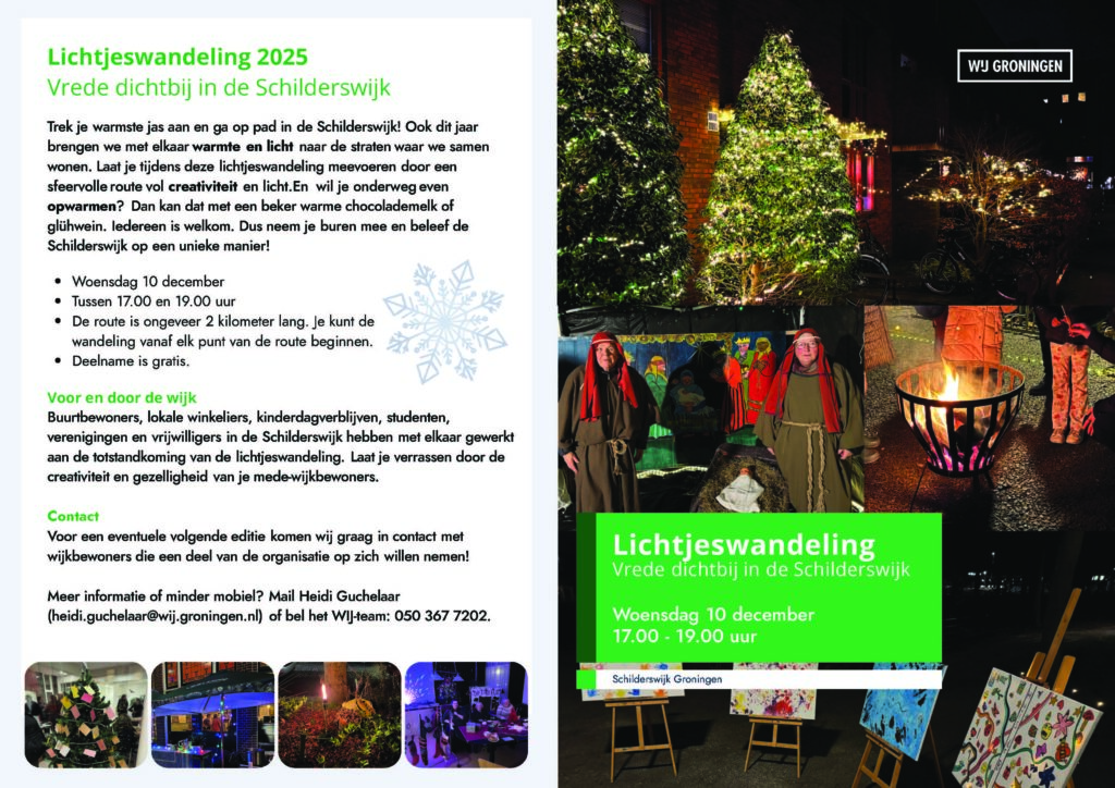 Trek je warmste jas aan en ga op pad in de Schilderswijk! Ook dit jaar brengen we met elkaar warmte en licht naar de straten waar we samen wonen. Laat je tijdens deze lichtjeswandeling meevoeren door een