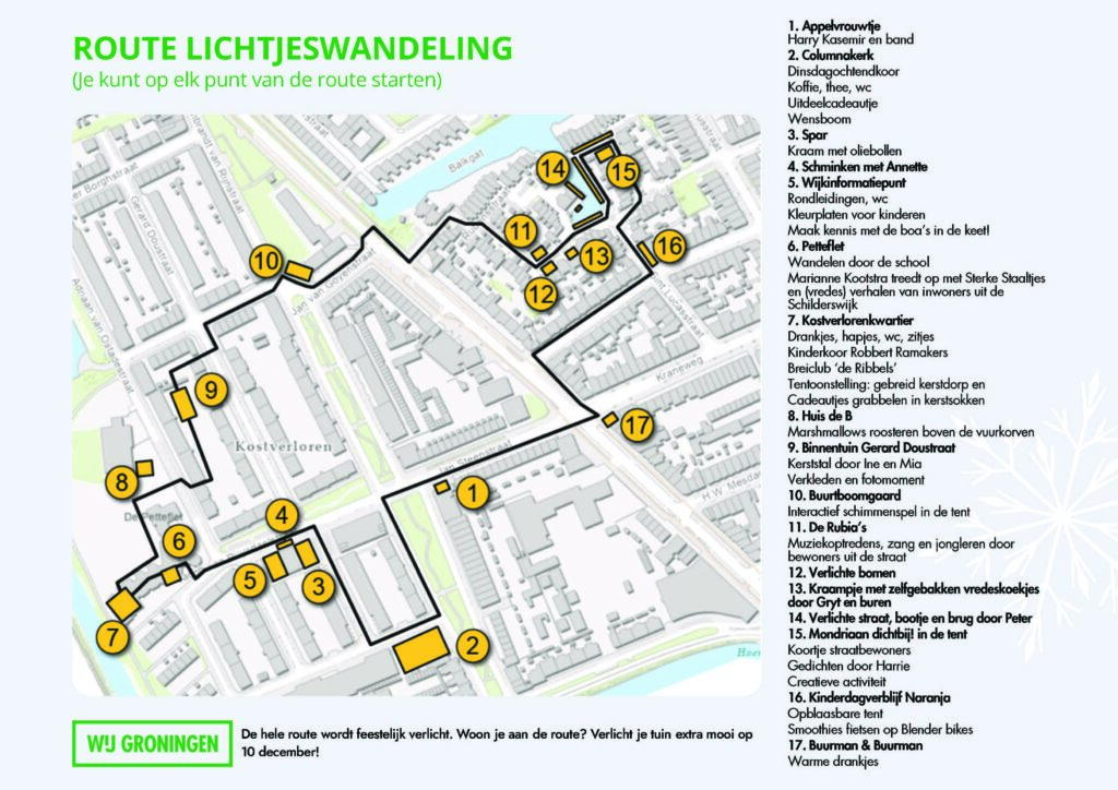 Buurtbewoners, lokale winkeliers, kinderdagverblijven, studenten, verenigingen en vrijwilligers in de Schilderswijk hebben met elkaar gewerkt aan de totstandkoming van de lichtjeswandeling. Laat je verrassen door de creativiteit en gezelligheid van je mede-wijkbewoners.